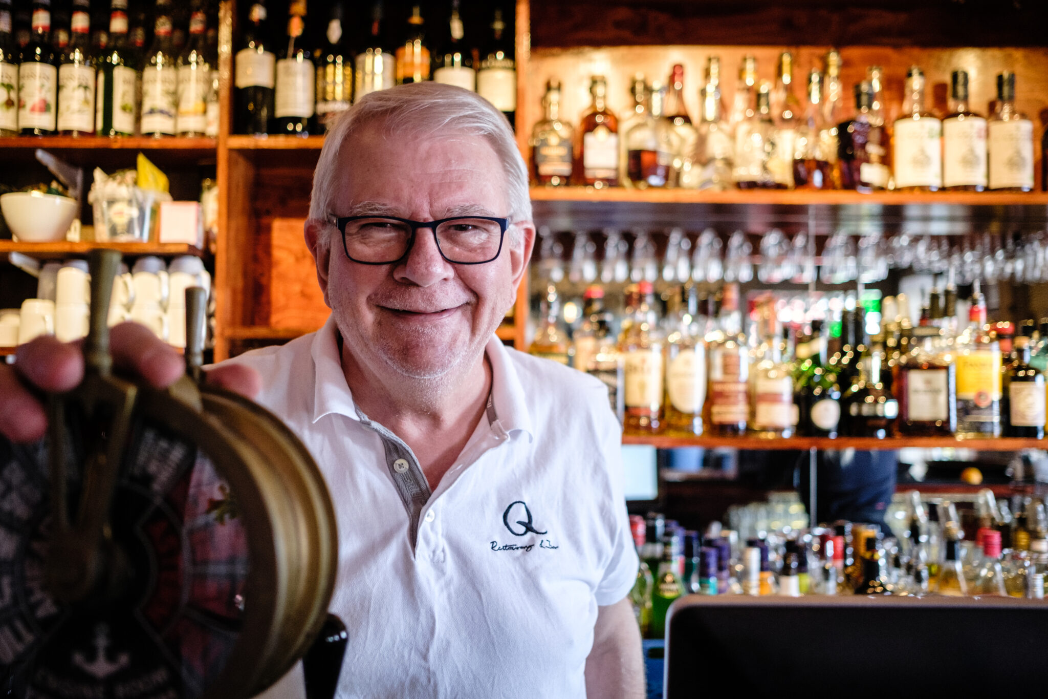Jon har tillbringat mycket tid i Grebbestad och när en restaurang blev till salu i årsskiftet 2008/2009 så köpte han restaurangen och flyttade dit. På den tiden hade Q Restaurang & Barendast 30 sittplatser, men under åren har restaurangen utvecklats så att det idag finns totalt 120 sittplatser inomhus, i glasverandan och på uteserveringen. Under den gångna vintern har restaurangen fått en ansiktslyftning där man tagit bort lite av sjöbodkänslan genom att måla väggarna i ljusa färger, men behållit en del av de vackra antikviteterna med anknytning till havet. En nyhet är att man har skapat ett galleri med vackra målningar på väggarna i tusch och akvarell av den norska konstnären Hanne Bringager.